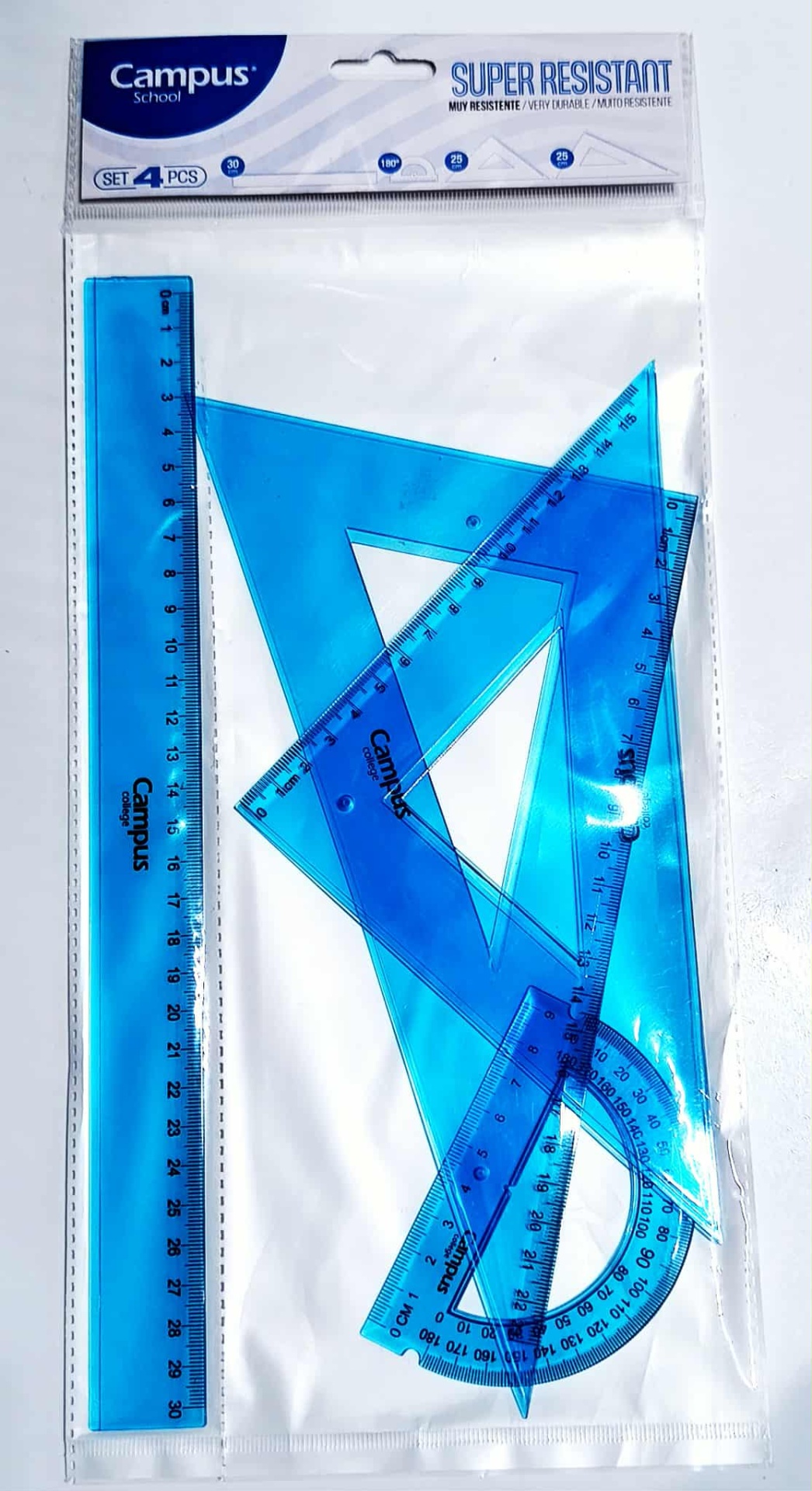 Este conjunto de desenho da Campus inclui 4 peças essenciais: régua de 30 cm, esquadro de 16 cm, cartabão de 23 cm e transferidor de 180°. Todas as peças são biseladas, super flexíveis e fabricadas em plástico resistente e transparente, oferecendo visibilidade total e grande durabilidade.