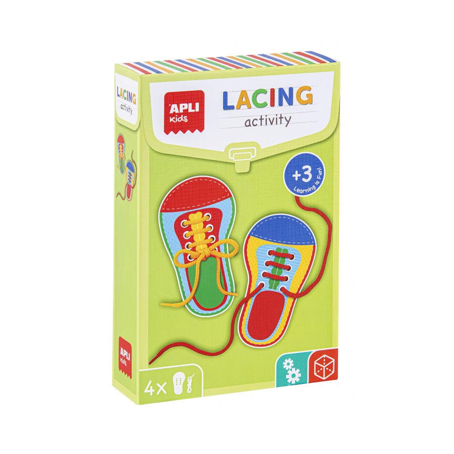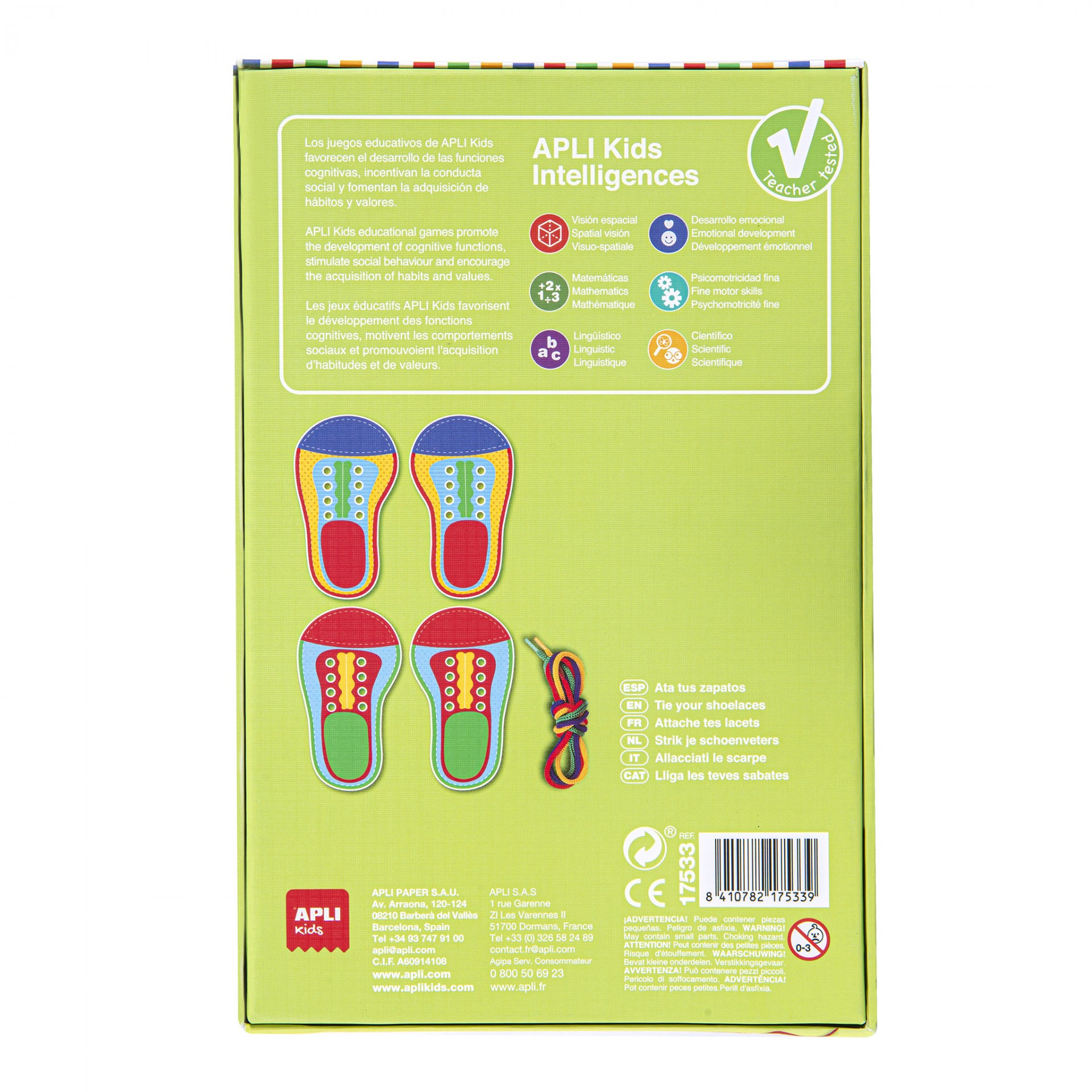 Jogo para aprender a amarrar cadarços. Cada jogo contém 4 cartas (2 pares) de 95 x 165 mm em formato de sapato e 4 cordões de cores diferentes. Inclui uma folha de instruções. Jogo com alto valor didático: desenvolve a coordenação motora fina e a coordenação olho-mão, ao mesmo tempo que estimula a imaginação e a criatividade. Recomendado para crianças a partir de 3 anos.