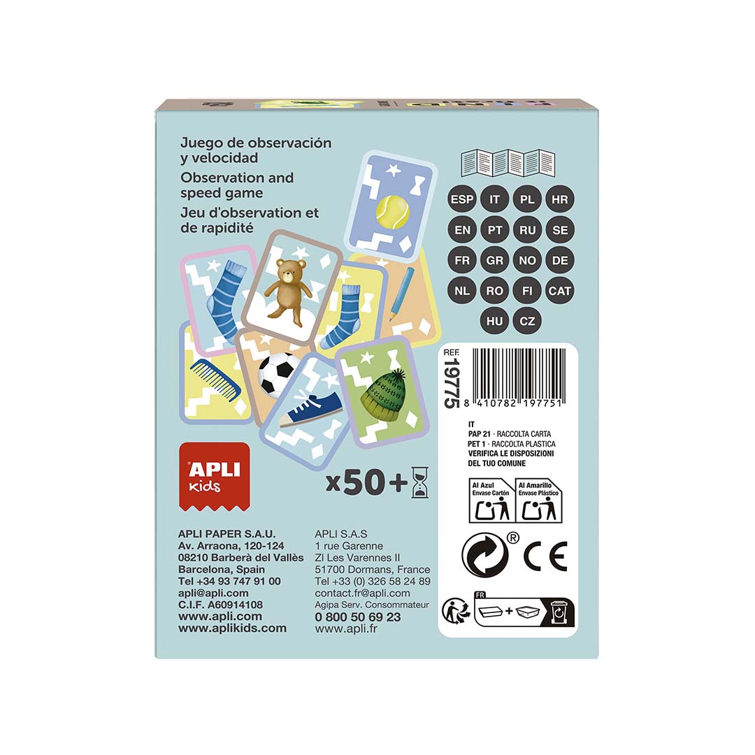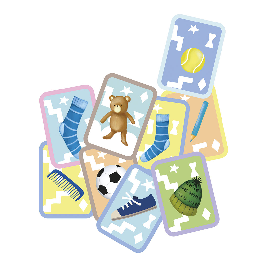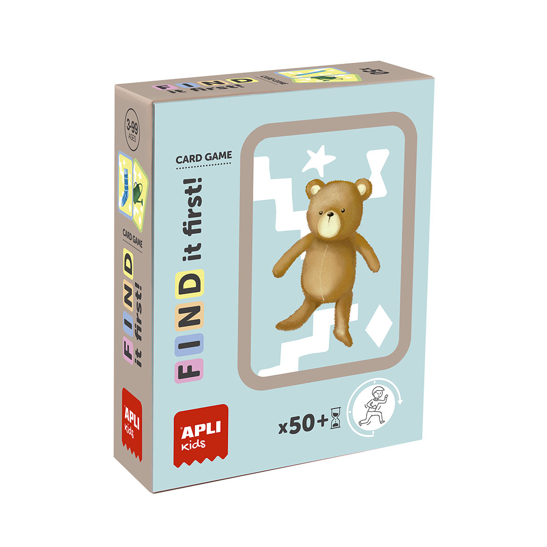 Jogo de cartas "Encontre primeiro!" de observação e velocidade com tema de objetos. Inclui 50 cartas duplas, uma ampulheta e um menu suspenso com instruções. Tamanho da carta: 63 x 88 mm.