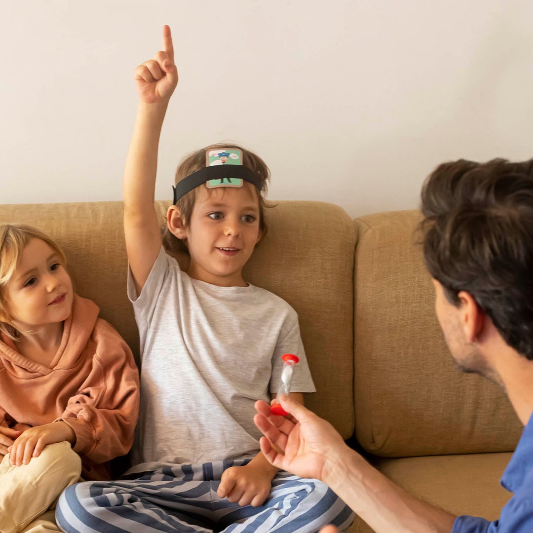 O jogo consiste em primeiro colocar o baralho de cartas virado para baixo. Um jogador rouba uma carta sem olhar para ela e o outro jogador coloca a carta na testa usando a fita adesiva (com o desenho visível para ele). Vire a ampulheta! O jogador deve fazer perguntas para adivinhar o personagem retratado na carta em sua testa e descobrir a resposta antes que o tempo acabe. Se o jogador acertar antes do tempo acabar, vence!