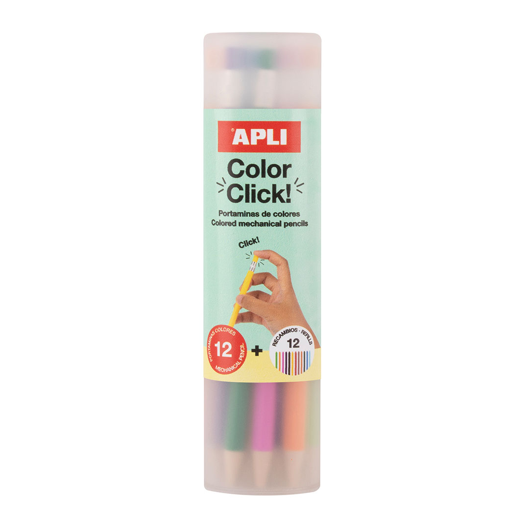 Estojo com 12 lapiseiras coloridas com corpo de plástico, 12 recargas e um afia com recipiente. Cores sortidas: violeta, creme, preto, roxo, amarelo, vermelho, marrom, laranja, verde, verde-escuro, azul e azul-claro. Cada lapiseira contém uma mina colorida de 2,6 mm, um botão de "clique" para apontar a ponta e uma tampa com numeração de cores.